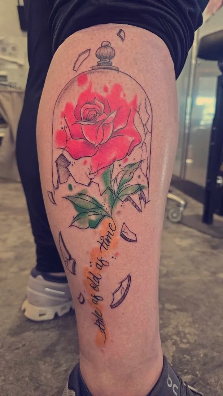 Hey there! I’m Caitlin—currently apprenticing under Molly (a.k.a. my best friend since 7th grade, so basically my partner in crime for life). I’ve been doodling since I could hold a crayon, and these days I’m all about bold colors and neo-traditional vibes—still leveling up my skills like a tattoo RPG character.